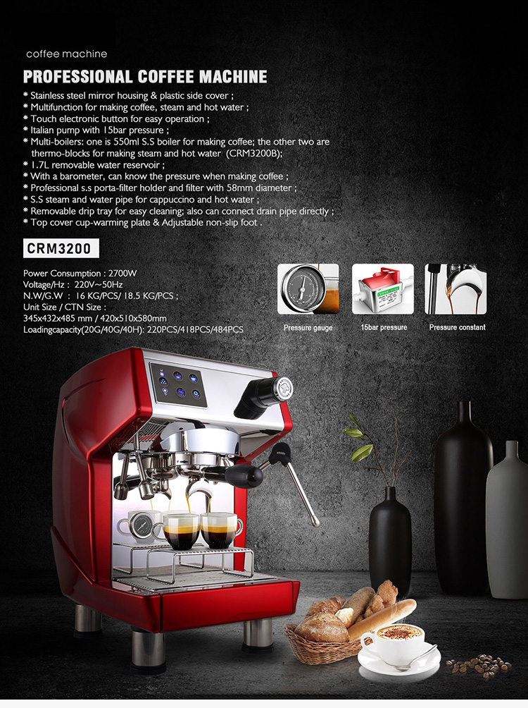 *Heating elements: One is single thermoblock for coffee; another is dual thermoblock for steam and hot water.*Professional porta-filter holder and filter with 58mm diameter to ensure perfect extraction and crema. *With descale function, can clean the boiler easily.